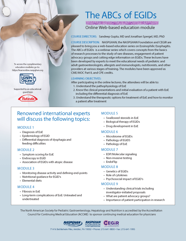 “The ABCs of EGIDs”.  This webinar series if for learners, non-physician providers, patients and families to learn more about Eosinophilic Disorders and treatments.  Complete the modules and learn everything you can about EGIDs.  Share with your Physicians!